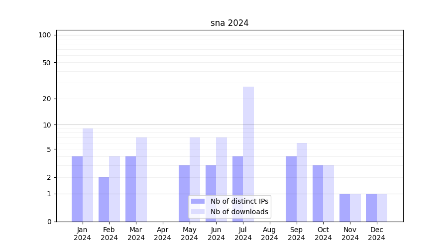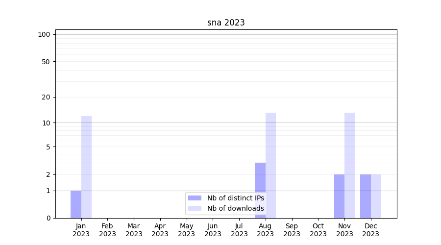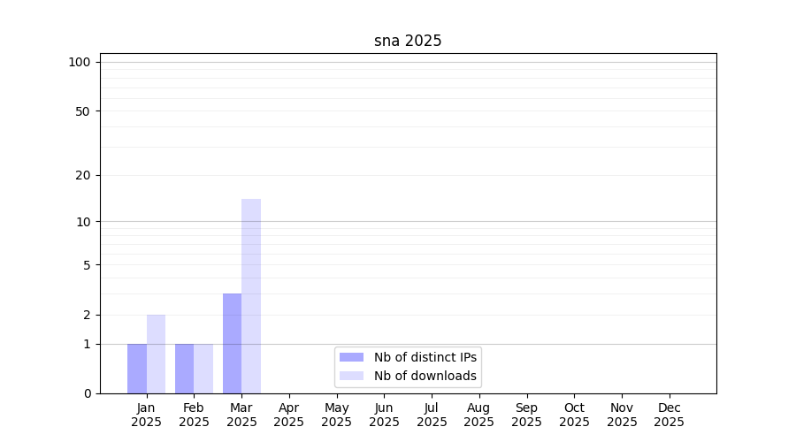 Number of downloads for experiment package sna, year by year, from 2025 back to 2014 (years with no downloads are omitted):