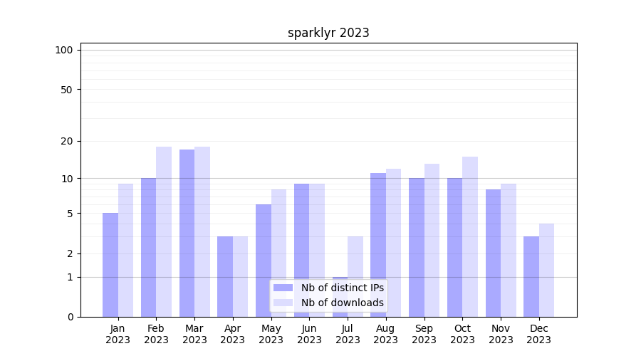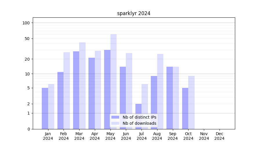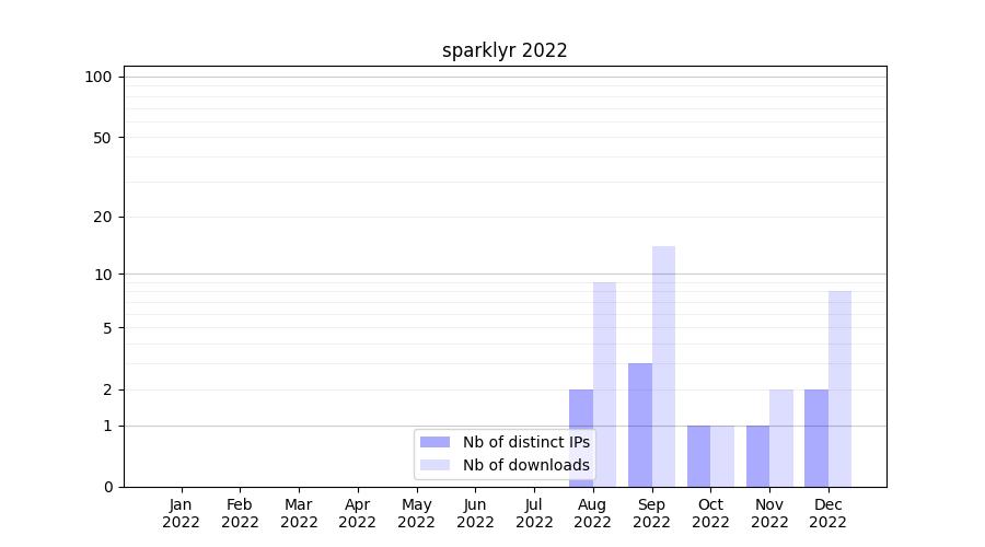 Number of downloads for experiment package sparklyr, year by year, from 2025 back to 2014 (years with no downloads are omitted):