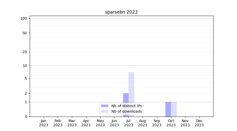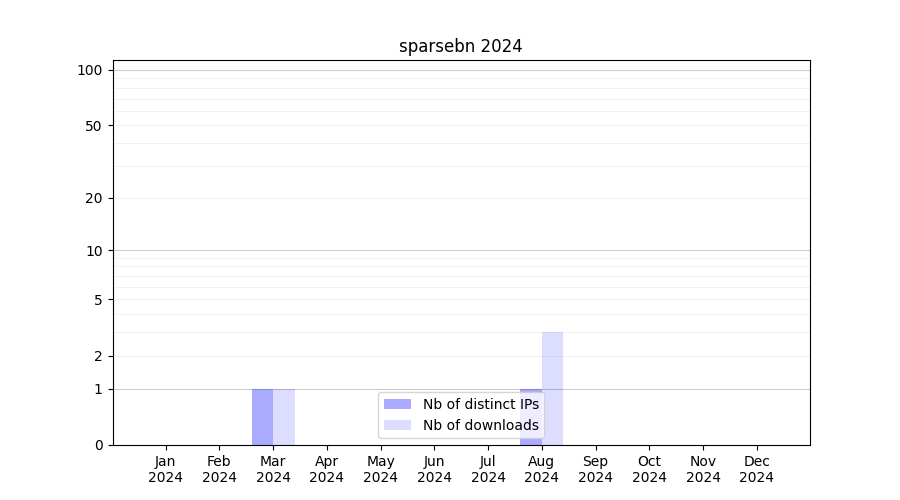 Number of downloads for experiment package sparsebn, year by year, from 2025 back to 2014 (years with no downloads are omitted):