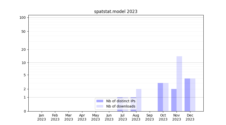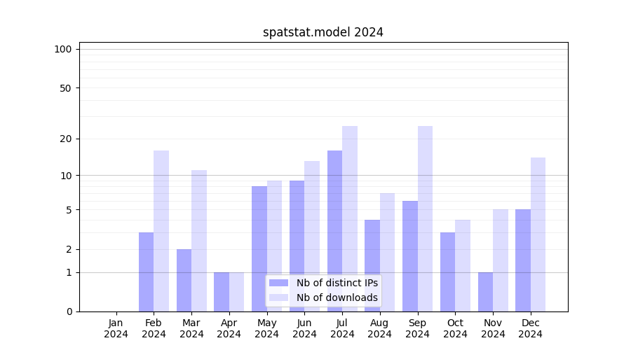 Number of downloads for experiment package spatstat.model, year by year, from 2025 back to 2014 (years with no downloads are omitted):