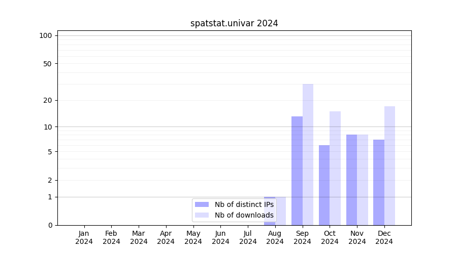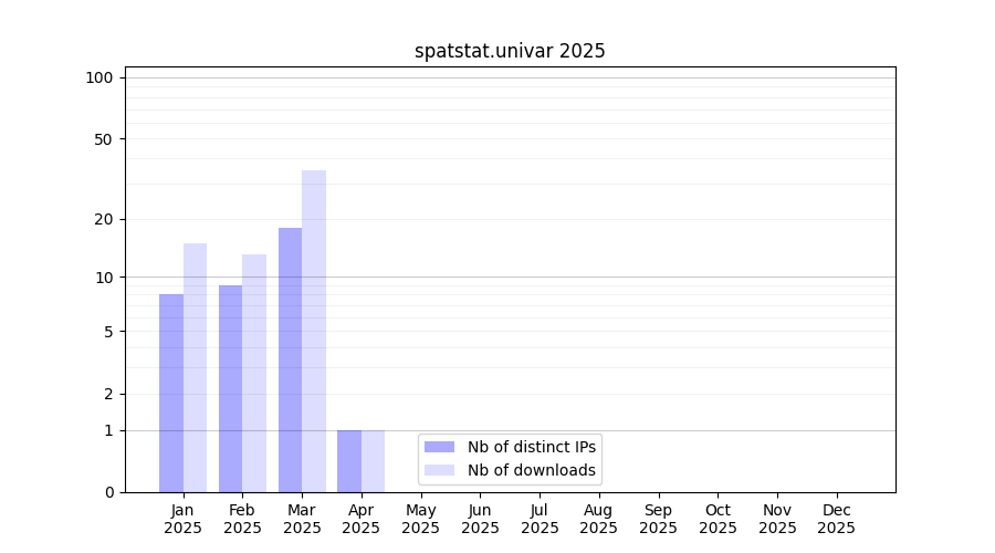 Number of downloads for experiment package spatstat.univar, year by year, from 2025 back to 2014 (years with no downloads are omitted):