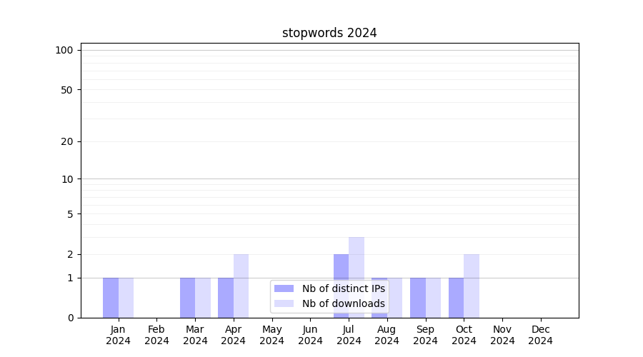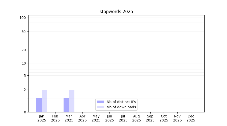 Number of downloads for experiment package stopwords, year by year, from 2025 back to 2014 (years with no downloads are omitted):