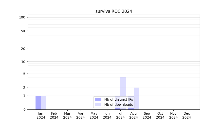 Number of downloads for experiment package survivalROC, year by year, from 2025 back to 2014 (years with no downloads are omitted):