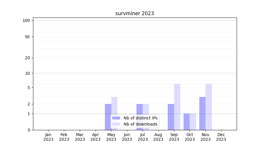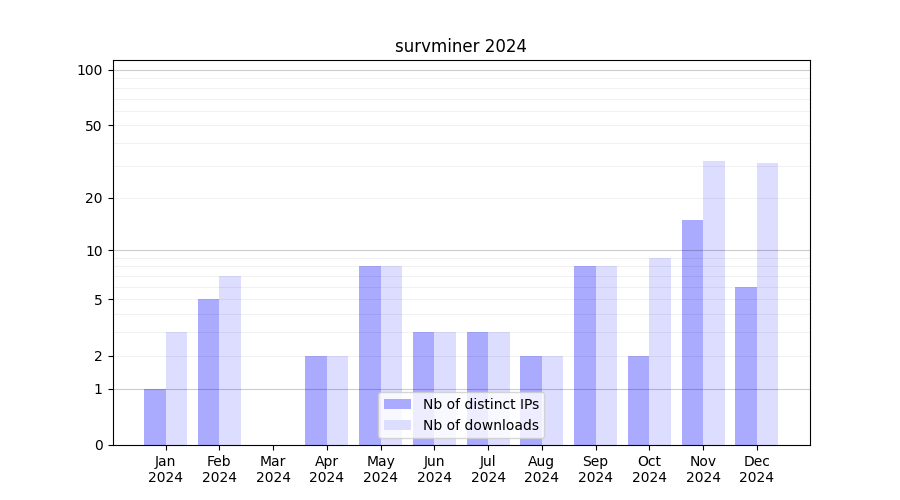 Number of downloads for experiment package survminer, year by year, from 2025 back to 2014 (years with no downloads are omitted):