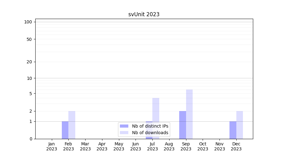 Number of downloads for experiment package svUnit, year by year, from 2025 back to 2014 (years with no downloads are omitted):