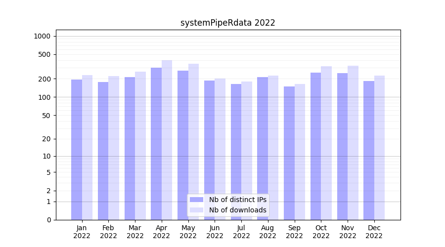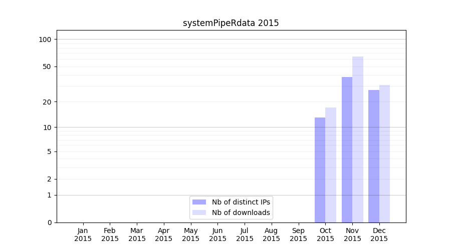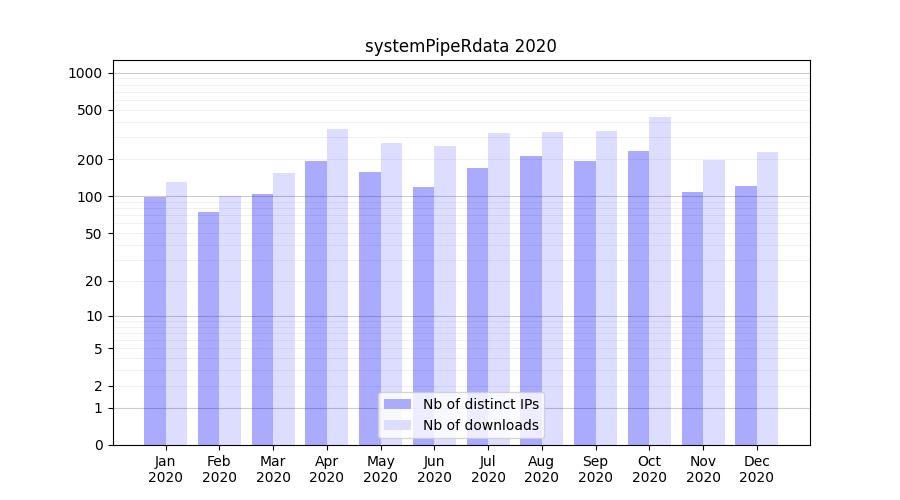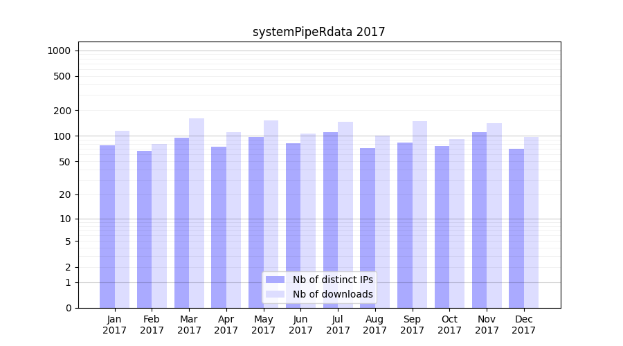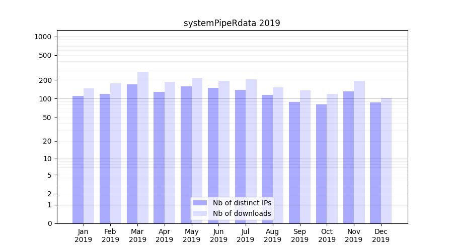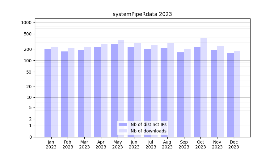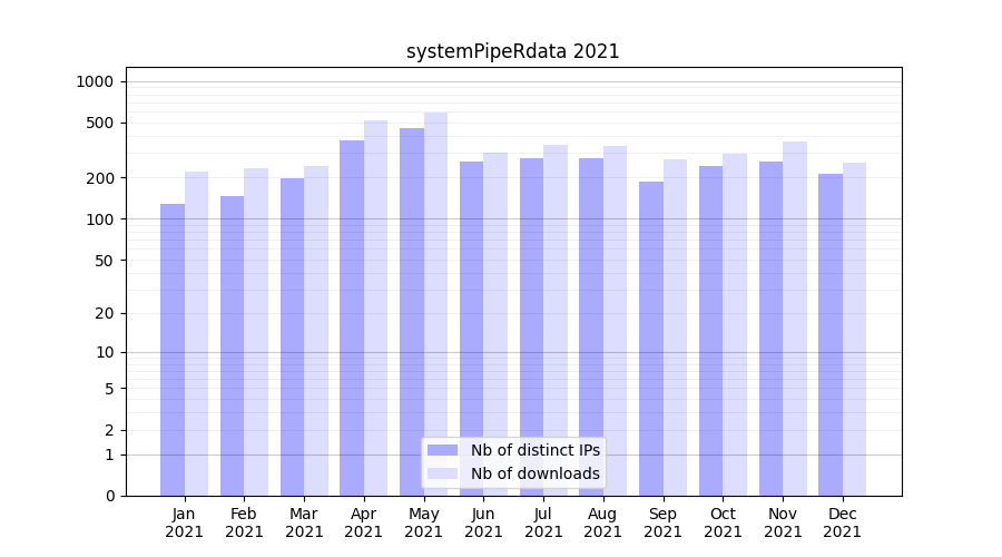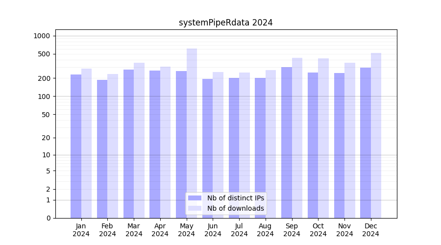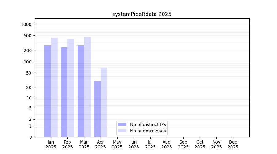 Number of downloads for experiment package systemPipeRdata, year by year, from 2025 back to 2014 (years with no downloads are omitted):