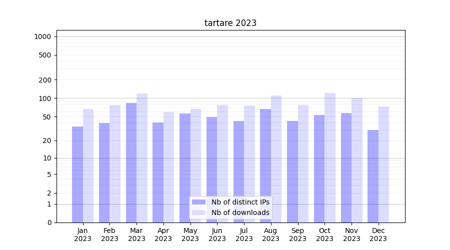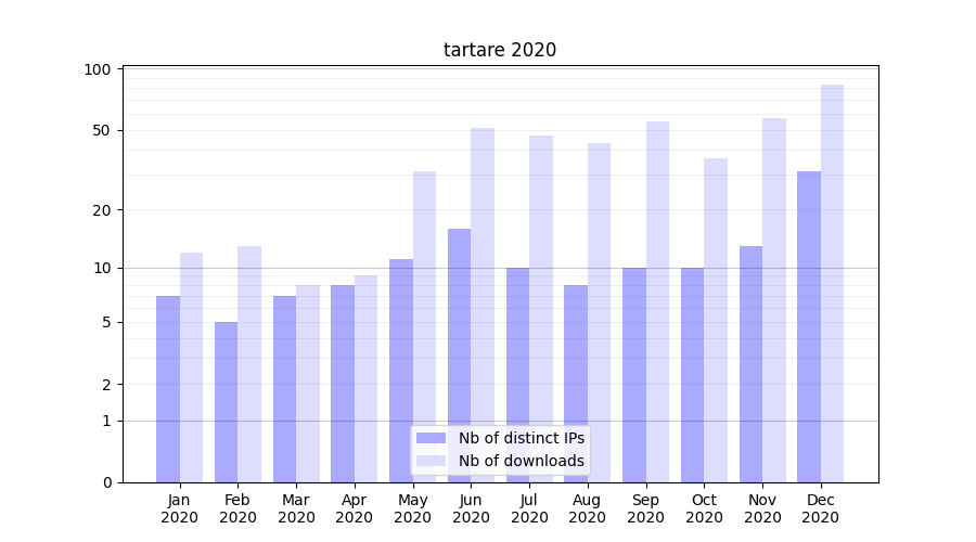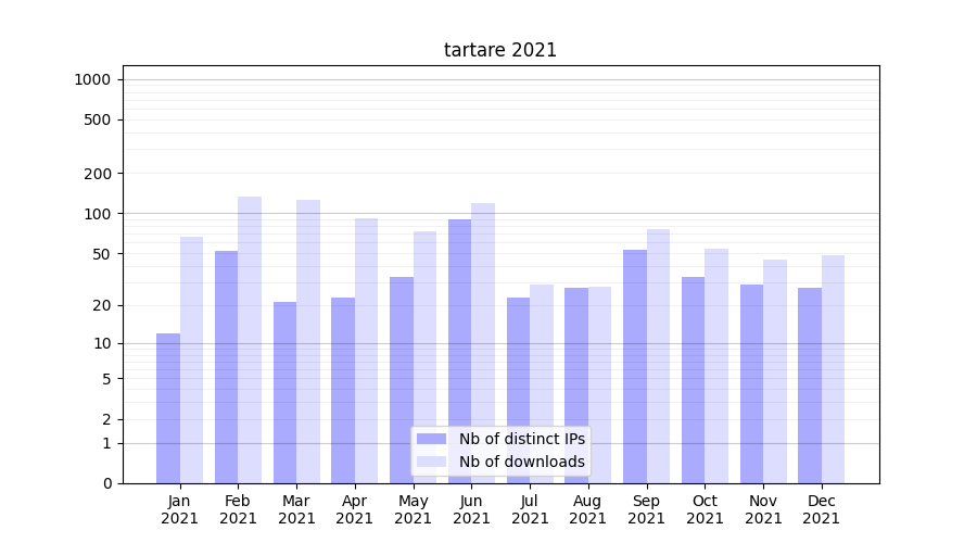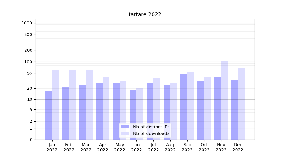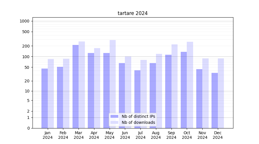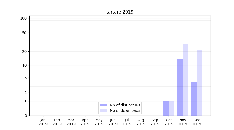 Number of downloads for experiment package tartare, year by year, from 2025 back to 2014 (years with no downloads are omitted):