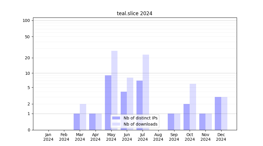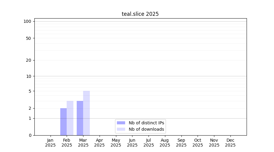 Number of downloads for experiment package teal.slice, year by year, from 2025 back to 2014 (years with no downloads are omitted):