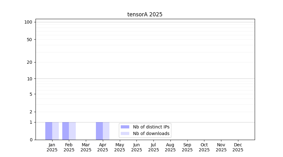 Number of downloads for experiment package tensorA, year by year, from 2025 back to 2014 (years with no downloads are omitted):