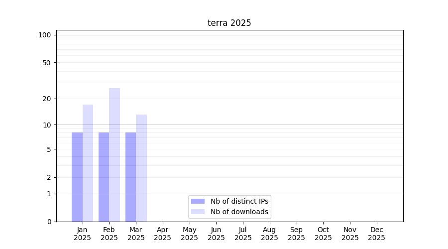 Number of downloads for experiment package terra, year by year, from 2025 back to 2014 (years with no downloads are omitted):
