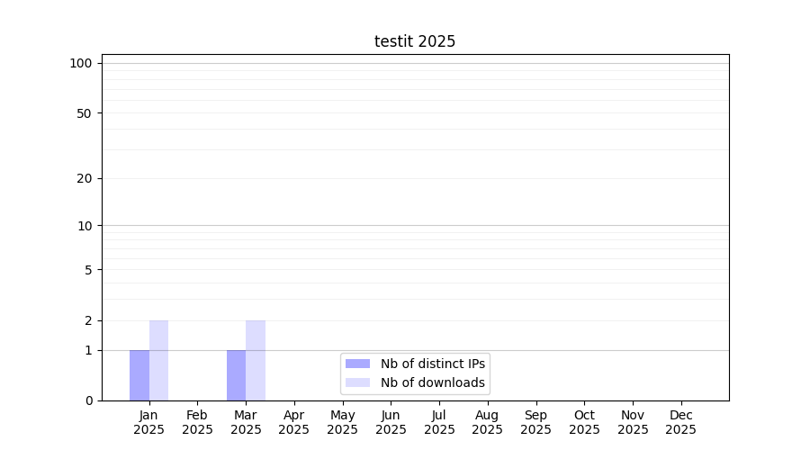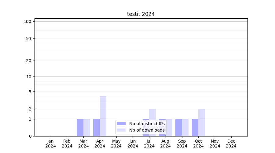 Number of downloads for experiment package testit, year by year, from 2025 back to 2014 (years with no downloads are omitted):