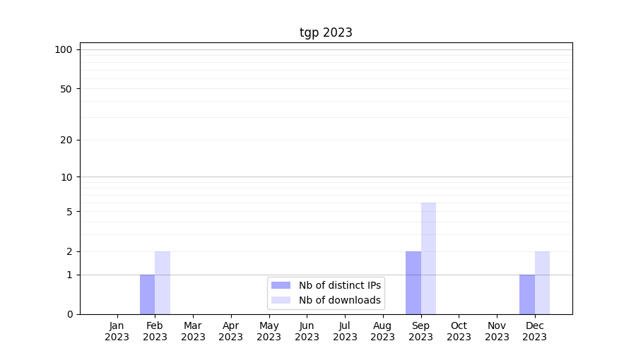 Number of downloads for experiment package tgp, year by year, from 2025 back to 2014 (years with no downloads are omitted):