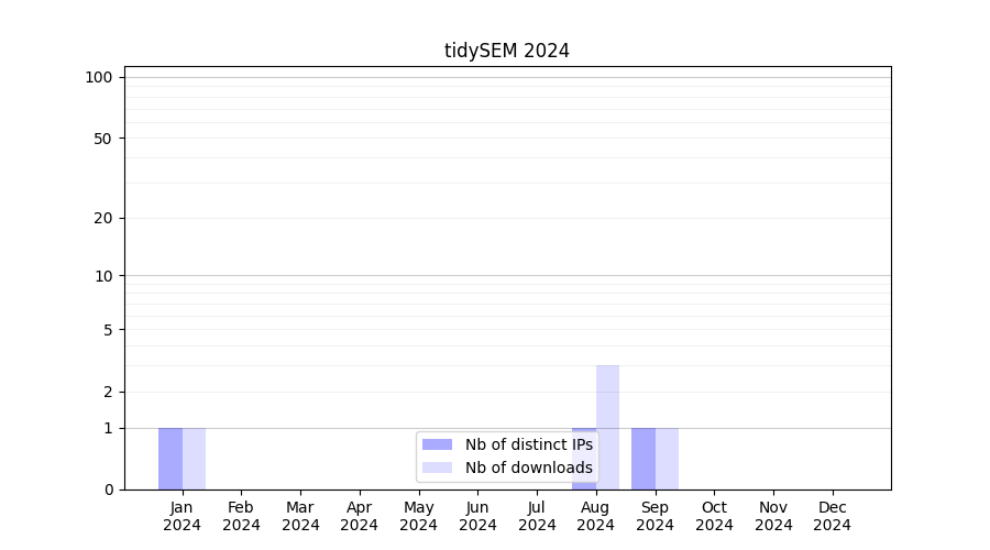 Number of downloads for experiment package tidySEM, year by year, from 2025 back to 2014 (years with no downloads are omitted):