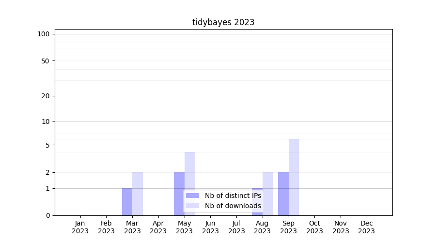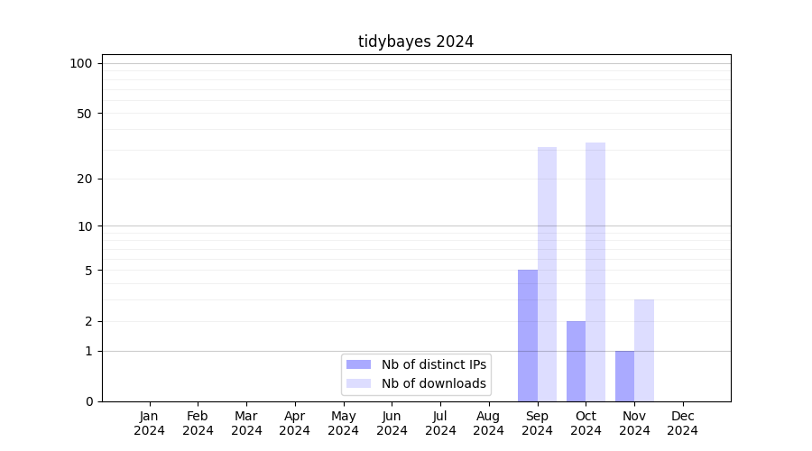Number of downloads for experiment package tidybayes, year by year, from 2025 back to 2014 (years with no downloads are omitted):