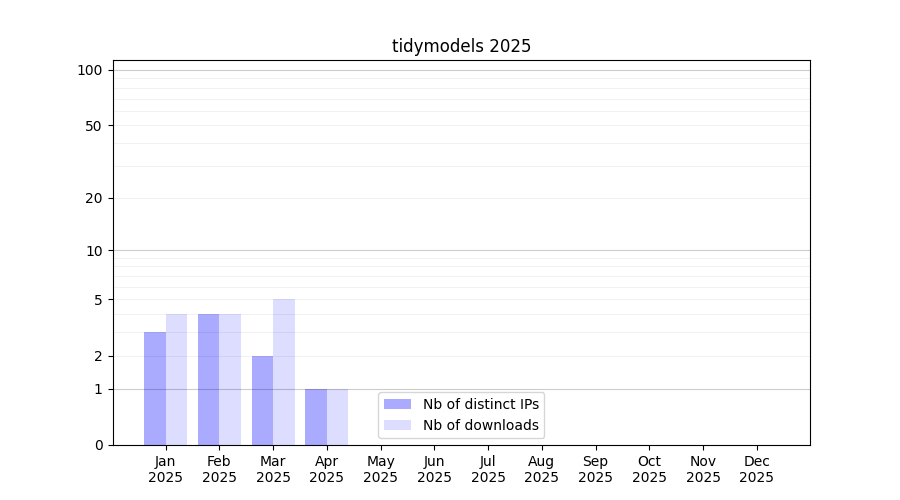 Number of downloads for experiment package tidymodels, year by year, from 2025 back to 2014 (years with no downloads are omitted):