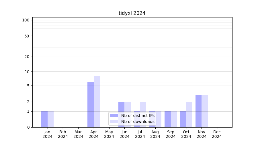 Number of downloads for experiment package tidyxl, year by year, from 2025 back to 2014 (years with no downloads are omitted):
