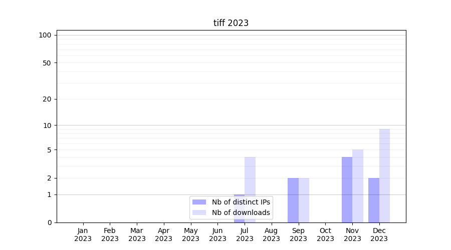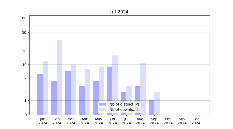 Number of downloads for experiment package tiff, year by year, from 2025 back to 2014 (years with no downloads are omitted):