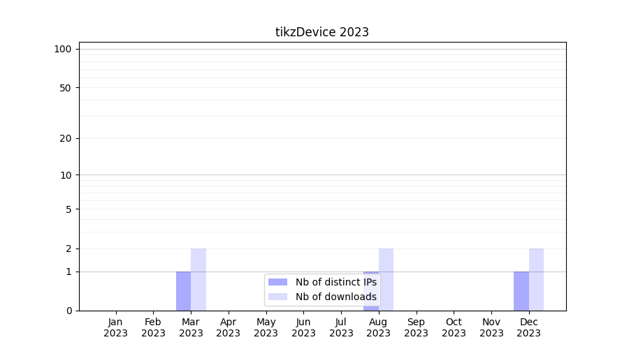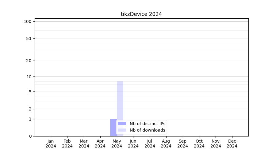Number of downloads for experiment package tikzDevice, year by year, from 2025 back to 2014 (years with no downloads are omitted):