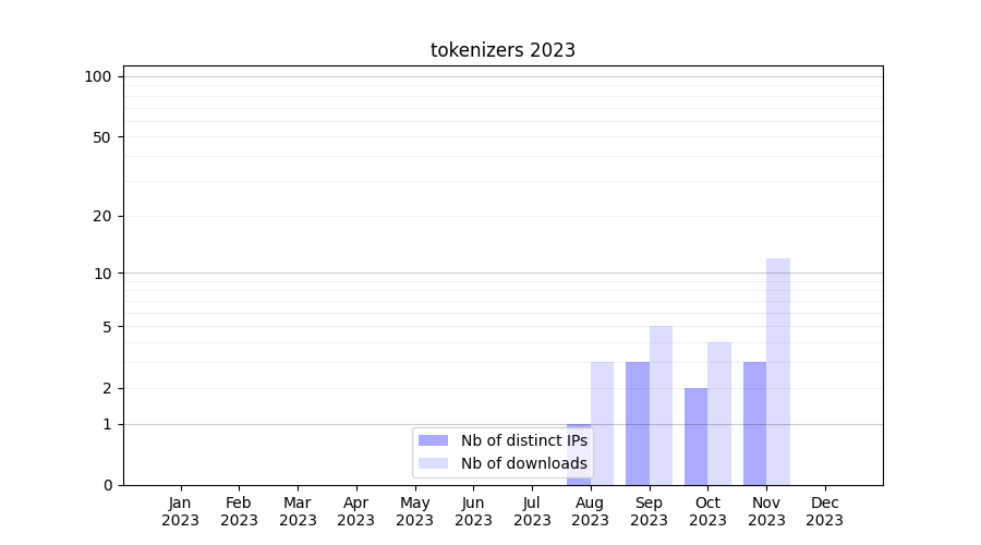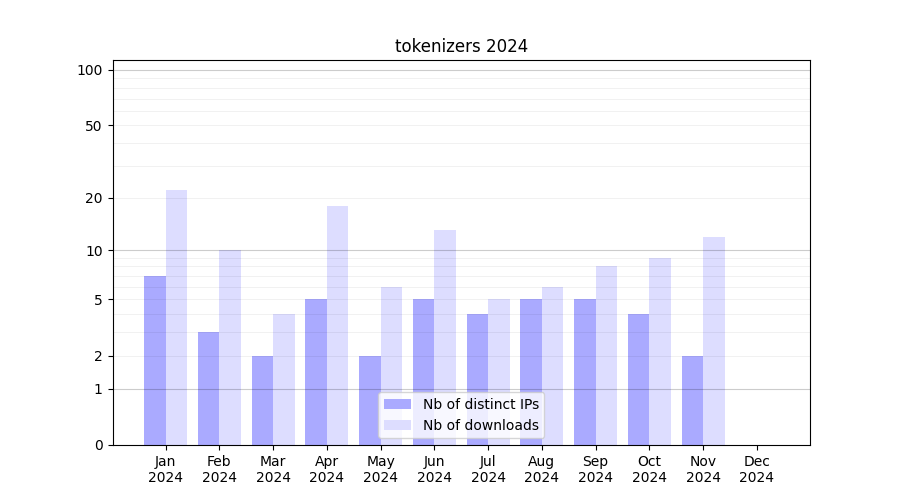 Number of downloads for experiment package tokenizers, year by year, from 2025 back to 2014 (years with no downloads are omitted):