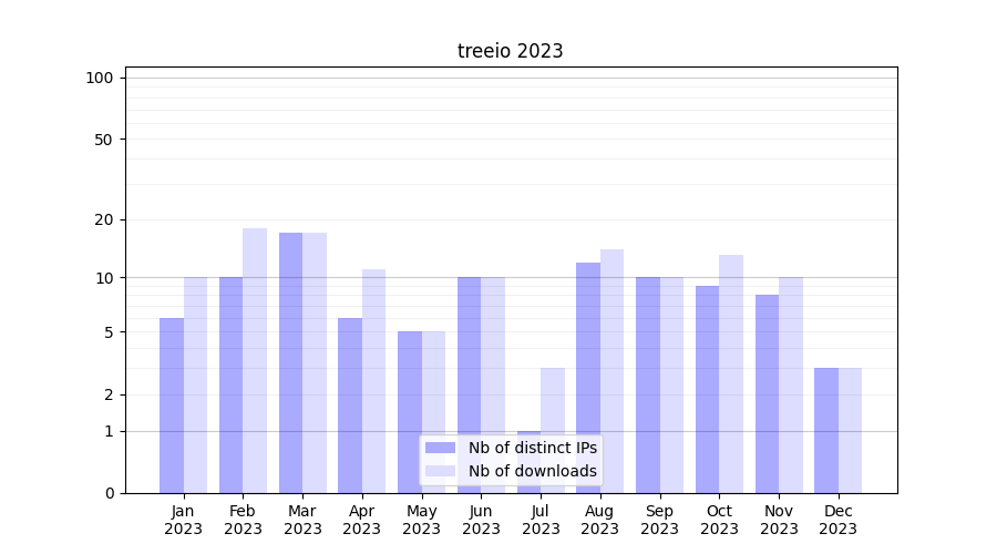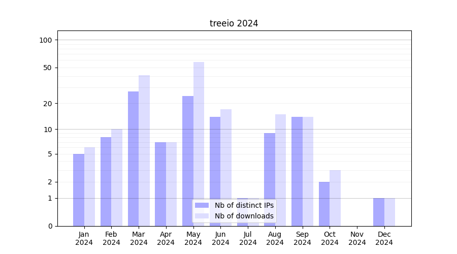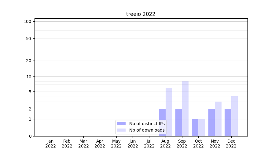 Number of downloads for experiment package treeio, year by year, from 2025 back to 2014 (years with no downloads are omitted):