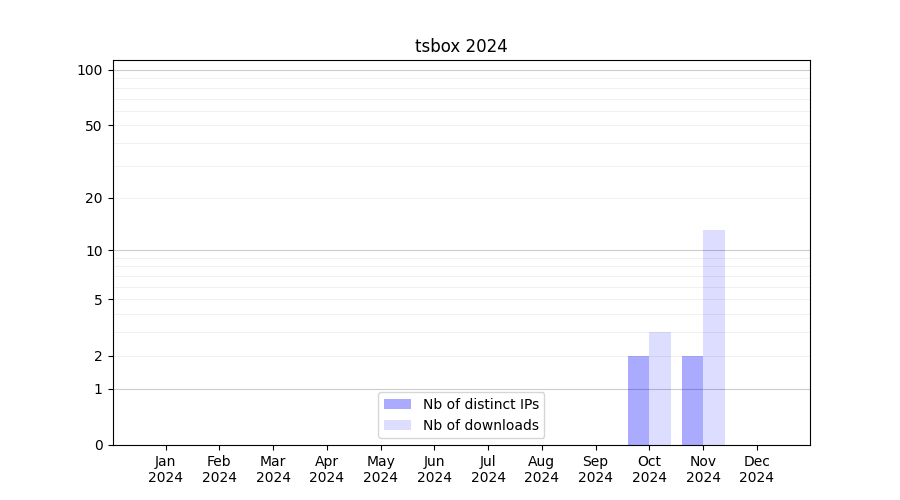 Number of downloads for experiment package tsbox, year by year, from 2025 back to 2014 (years with no downloads are omitted):