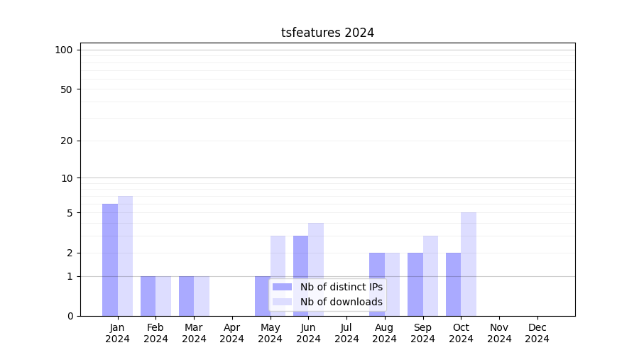 Number of downloads for experiment package tsfeatures, year by year, from 2025 back to 2014 (years with no downloads are omitted):