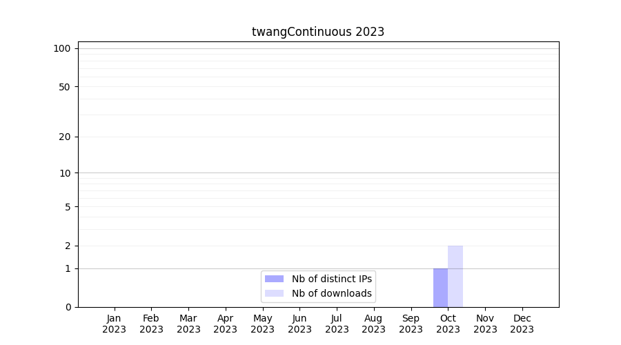 Number of downloads for experiment package twangContinuous, year by year, from 2025 back to 2014 (years with no downloads are omitted):