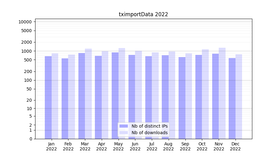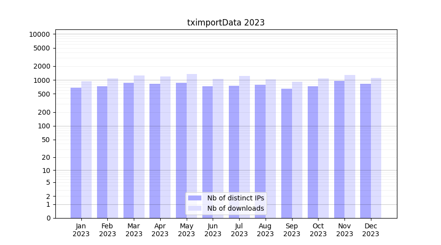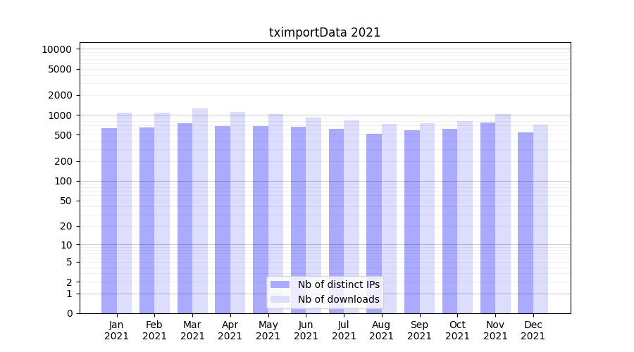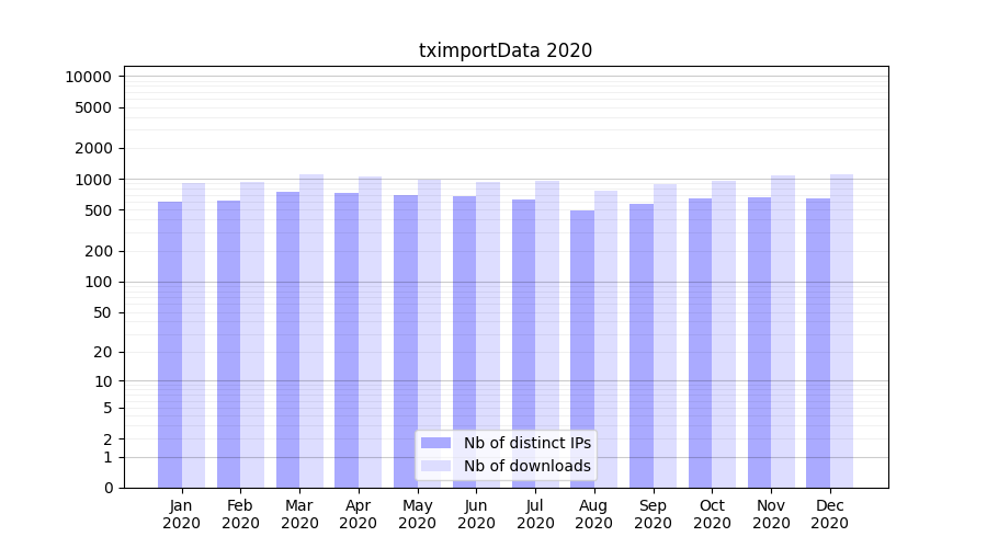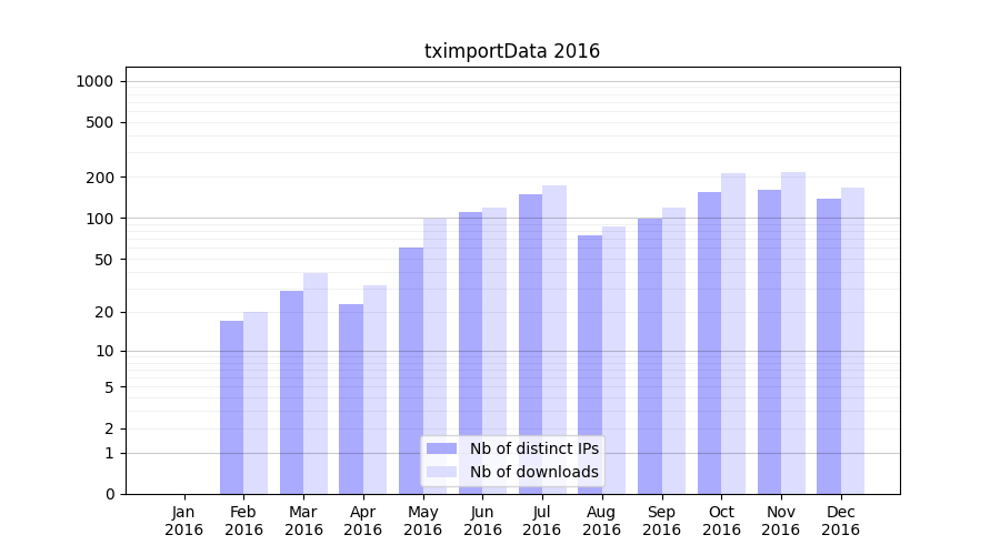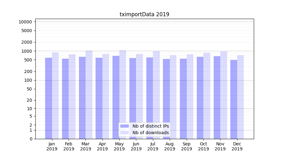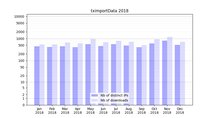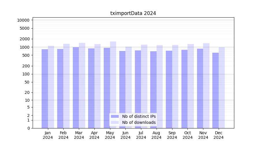 Number of downloads for experiment package tximportData, year by year, from 2025 back to 2014 (years with no downloads are omitted):