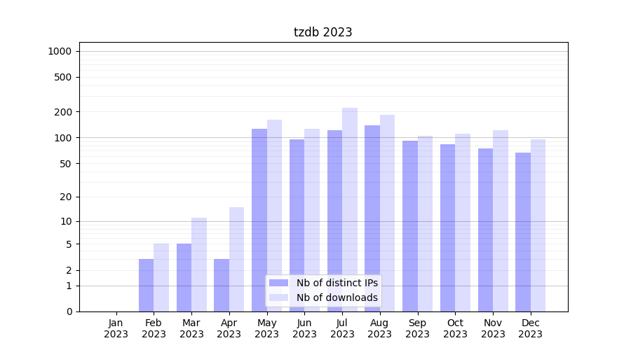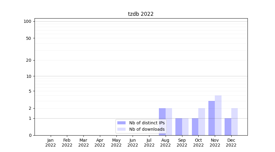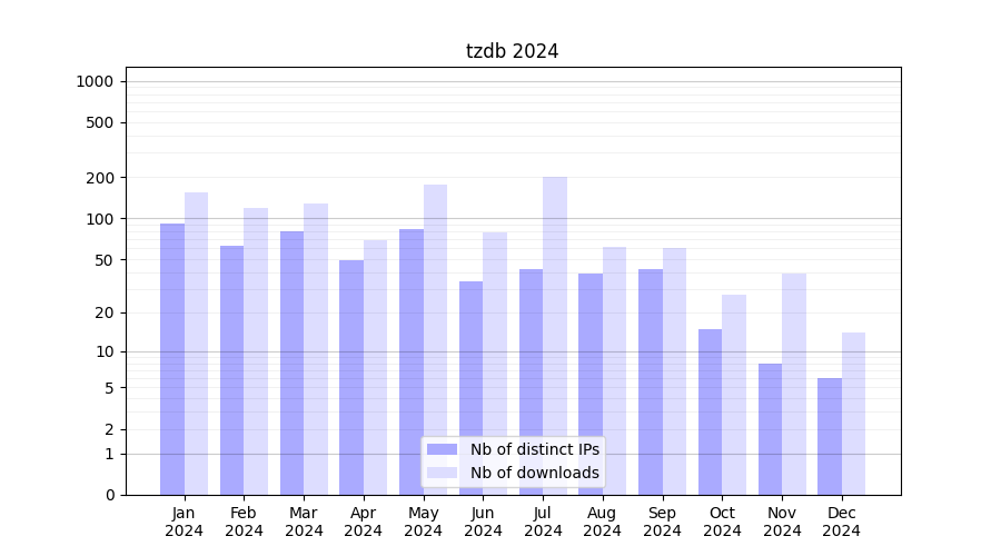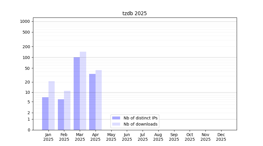 Number of downloads for experiment package tzdb, year by year, from 2025 back to 2014 (years with no downloads are omitted):