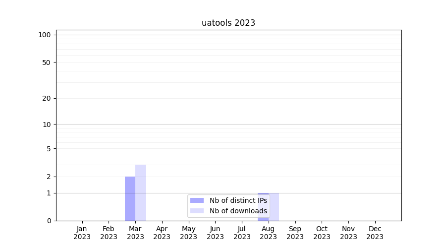 Number of downloads for experiment package uatools, year by year, from 2025 back to 2014 (years with no downloads are omitted):