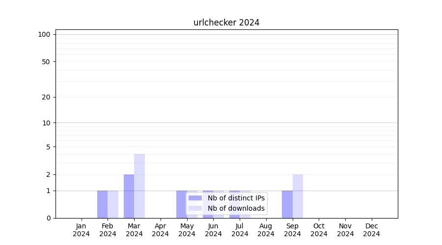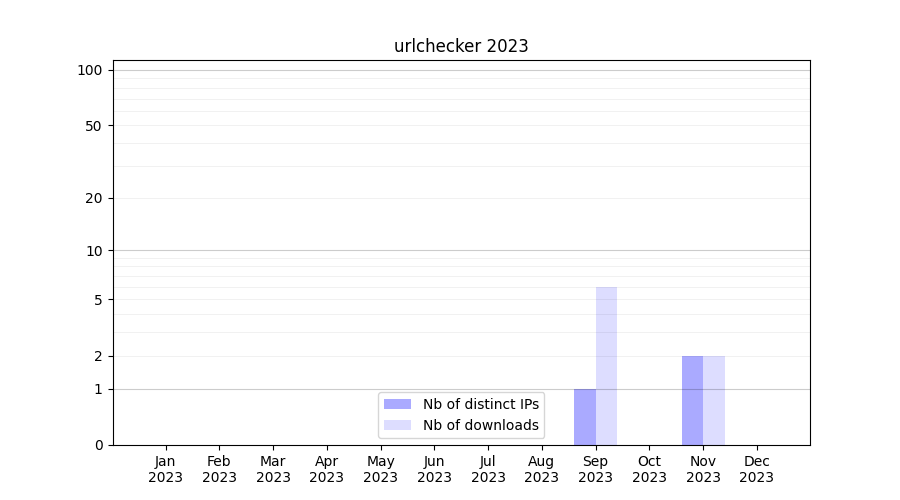 Number of downloads for experiment package urlchecker, year by year, from 2025 back to 2014 (years with no downloads are omitted):