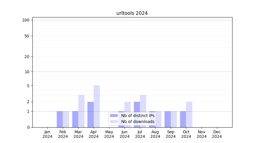 Number of downloads for experiment package urltools, year by year, from 2025 back to 2014 (years with no downloads are omitted):