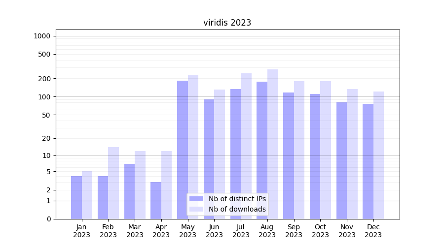 Number of downloads for experiment package viridis, year by year, from 2025 back to 2014 (years with no downloads are omitted):