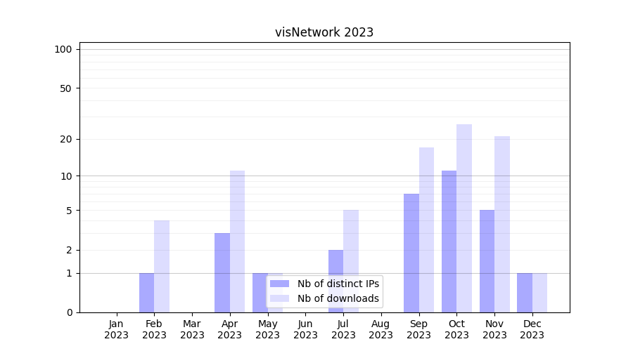 Number of downloads for experiment package visNetwork, year by year, from 2025 back to 2014 (years with no downloads are omitted):