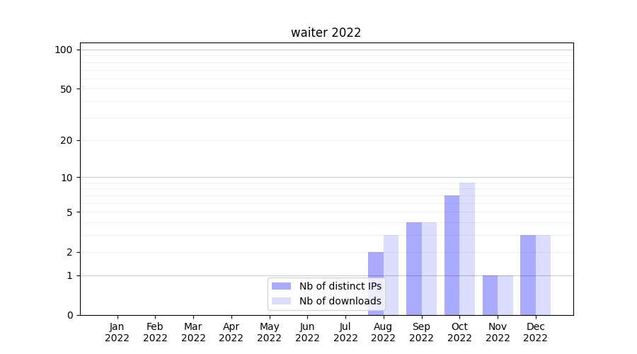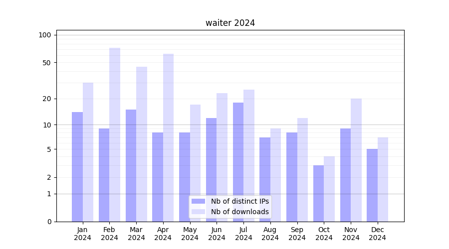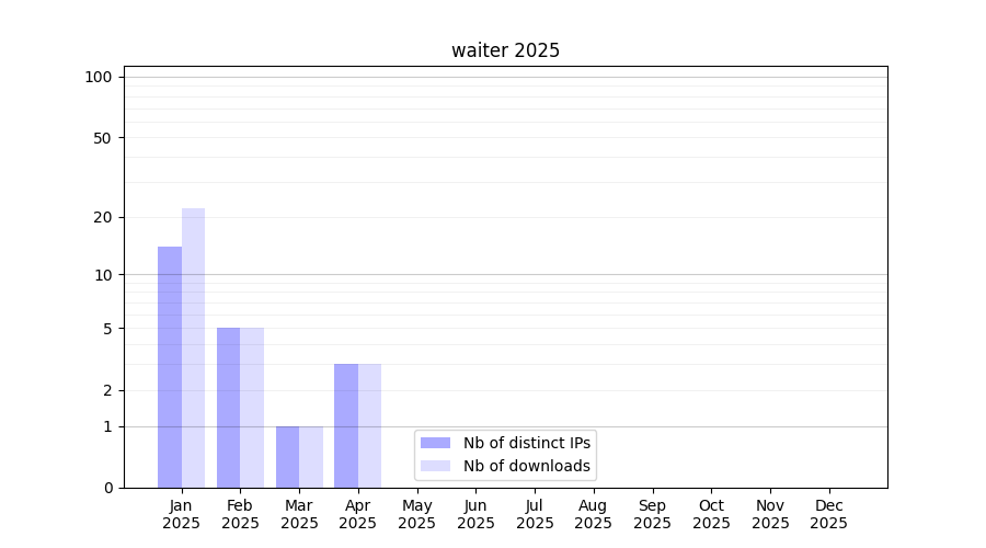 Number of downloads for experiment package waiter, year by year, from 2025 back to 2014 (years with no downloads are omitted):