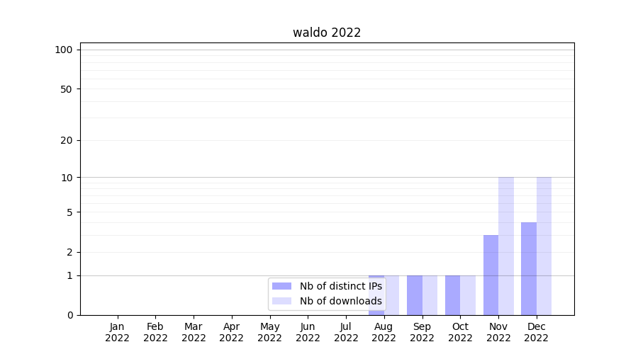 Number of downloads for experiment package waldo, year by year, from 2025 back to 2014 (years with no downloads are omitted):