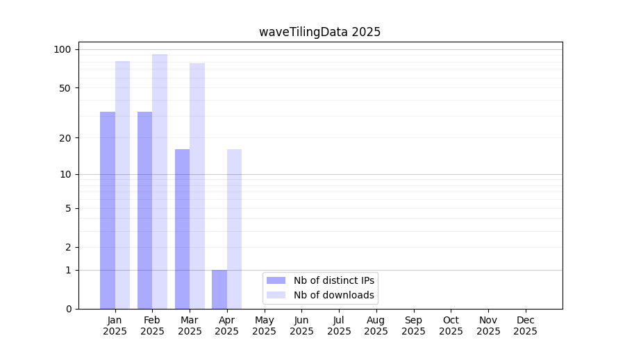 Number of downloads for experiment package waveTilingData, year by year, from 2025 back to 2014 (years with no downloads are omitted):