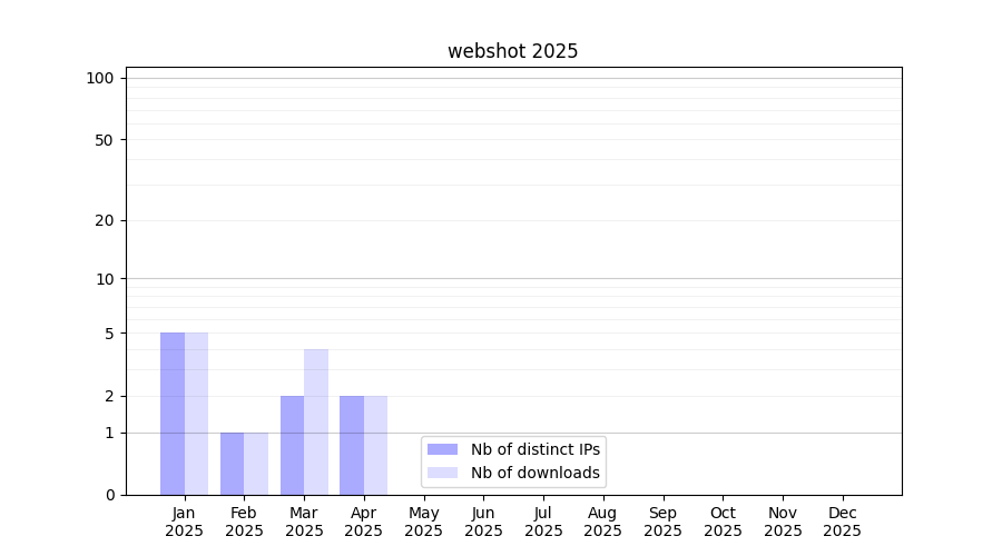 Number of downloads for experiment package webshot, year by year, from 2025 back to 2014 (years with no downloads are omitted):