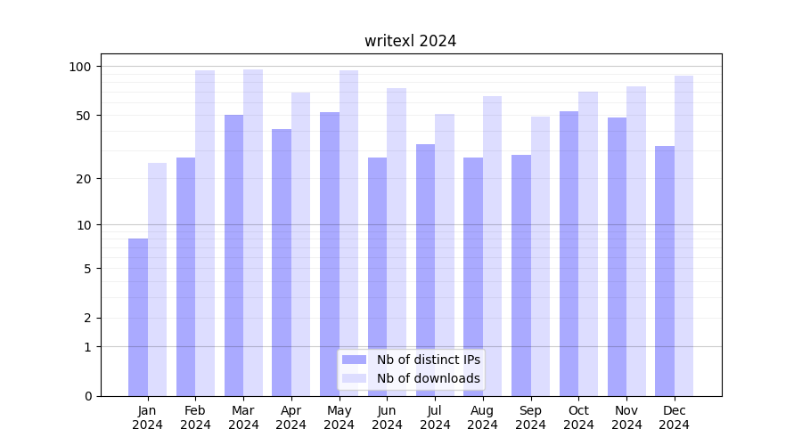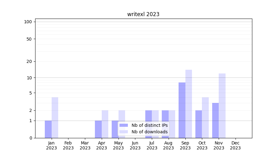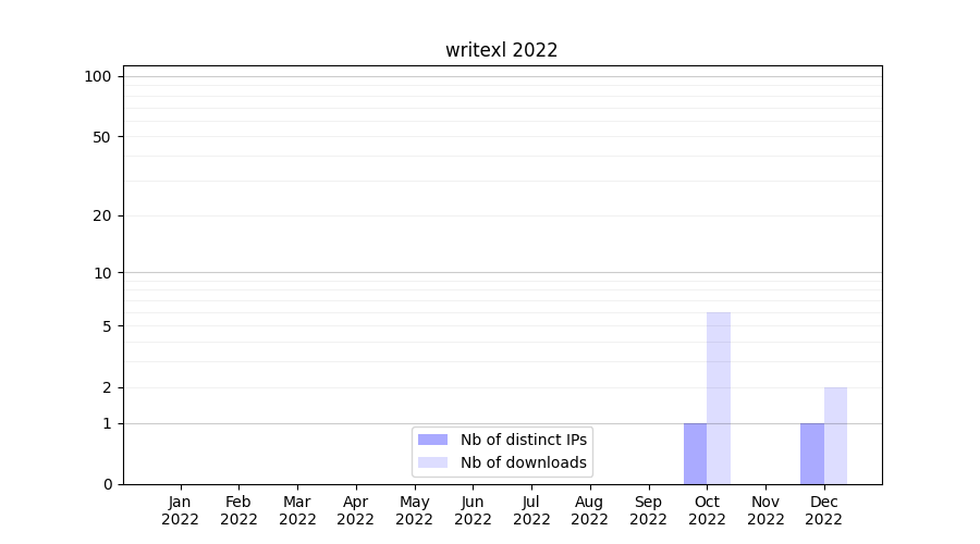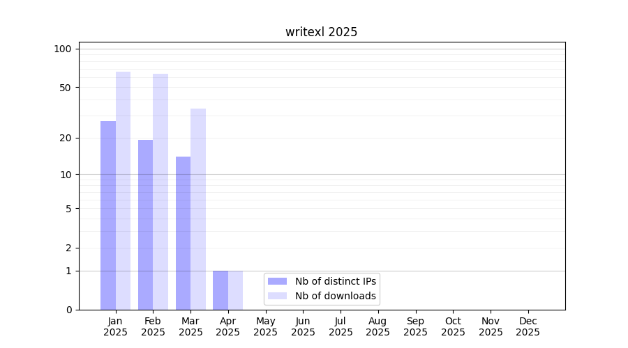 Number of downloads for experiment package writexl, year by year, from 2025 back to 2014 (years with no downloads are omitted):