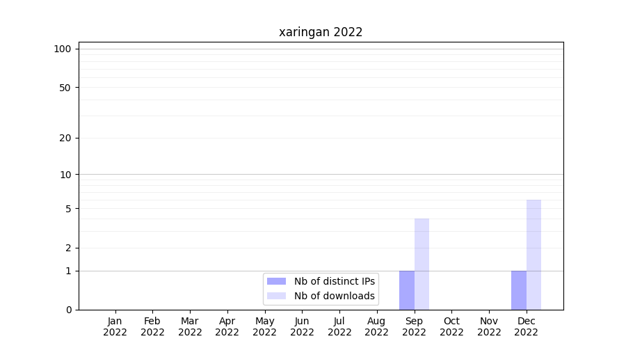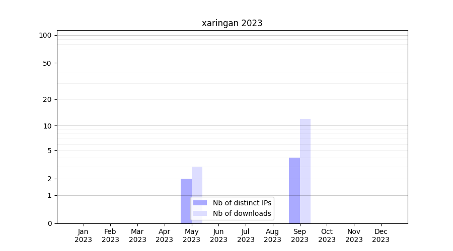 Number of downloads for experiment package xaringan, year by year, from 2025 back to 2014 (years with no downloads are omitted):