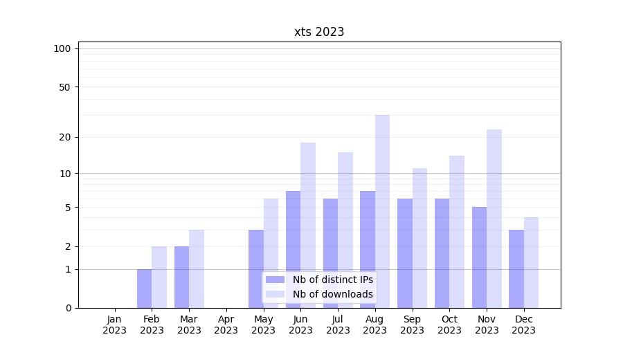 Number of downloads for experiment package xts, year by year, from 2025 back to 2014 (years with no downloads are omitted):