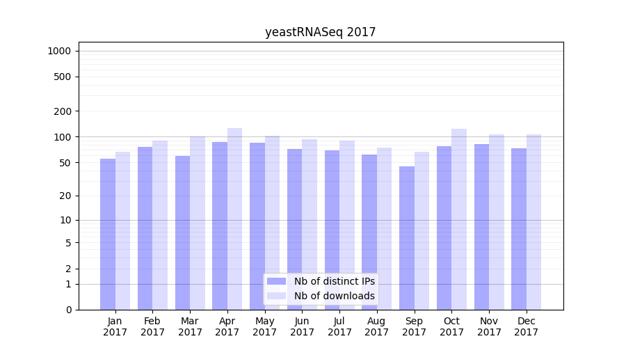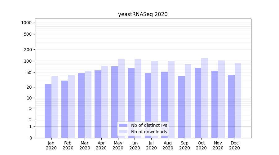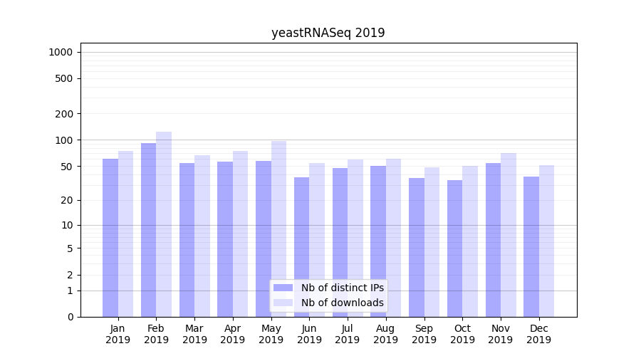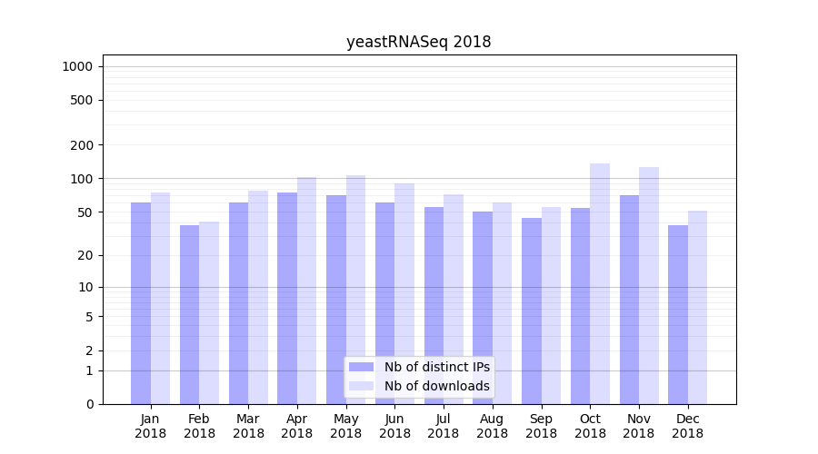 Number of downloads for experiment package yeastRNASeq, year by year, from 2025 back to 2014 (years with no downloads are omitted):