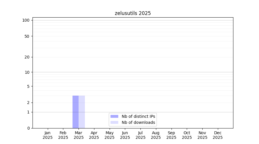 Number of downloads for experiment package zelusutils, year by year, from 2025 back to 2014 (years with no downloads are omitted):