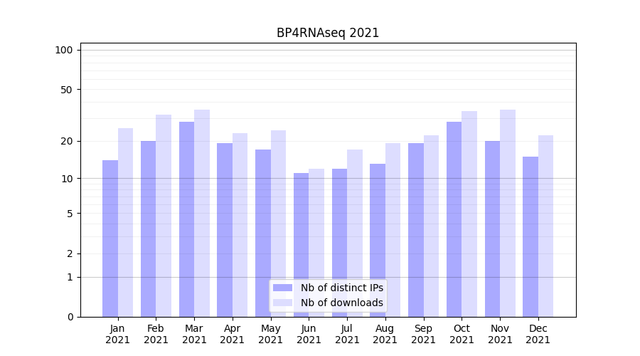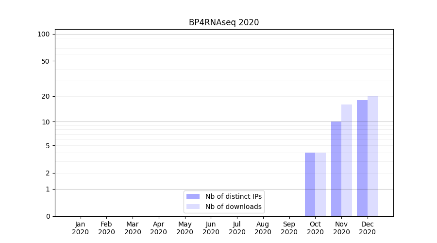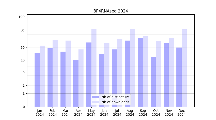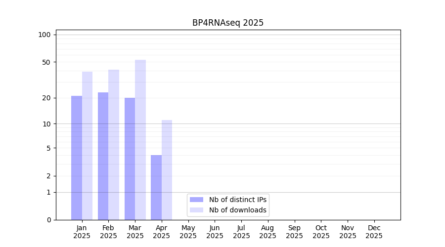 Number of downloads for workflow package BP4RNAseq, year by year, from 2025 back to 2015 (years with no downloads are omitted):