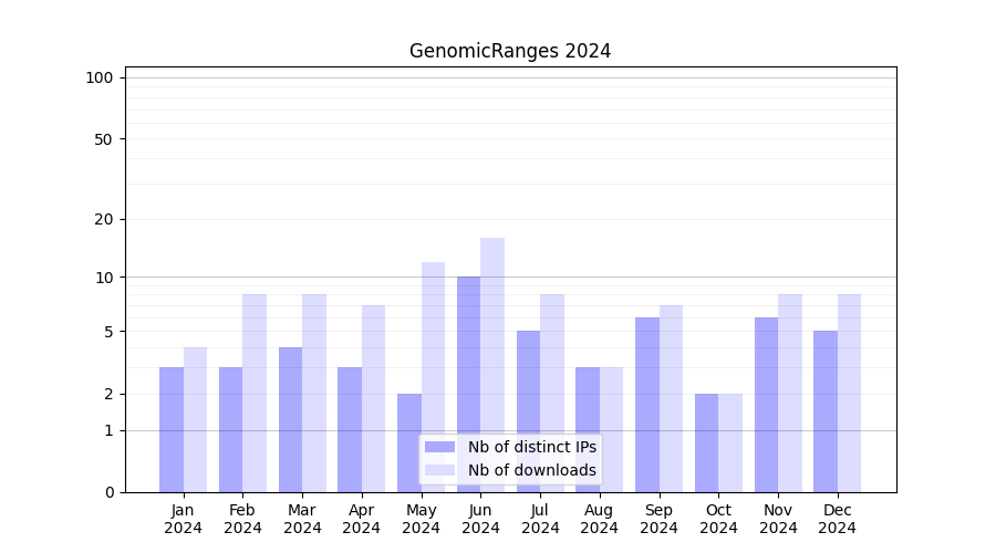 Number of downloads for workflow package GenomicRanges, year by year, from 2025 back to 2015 (years with no downloads are omitted):