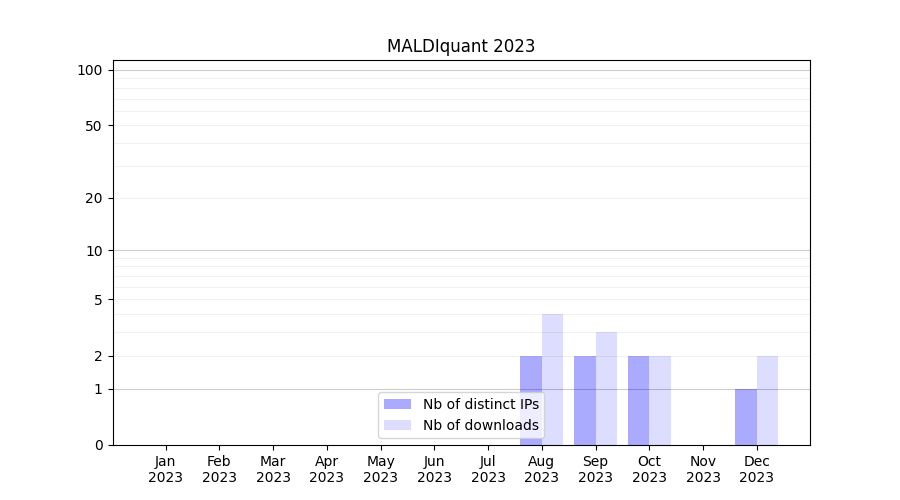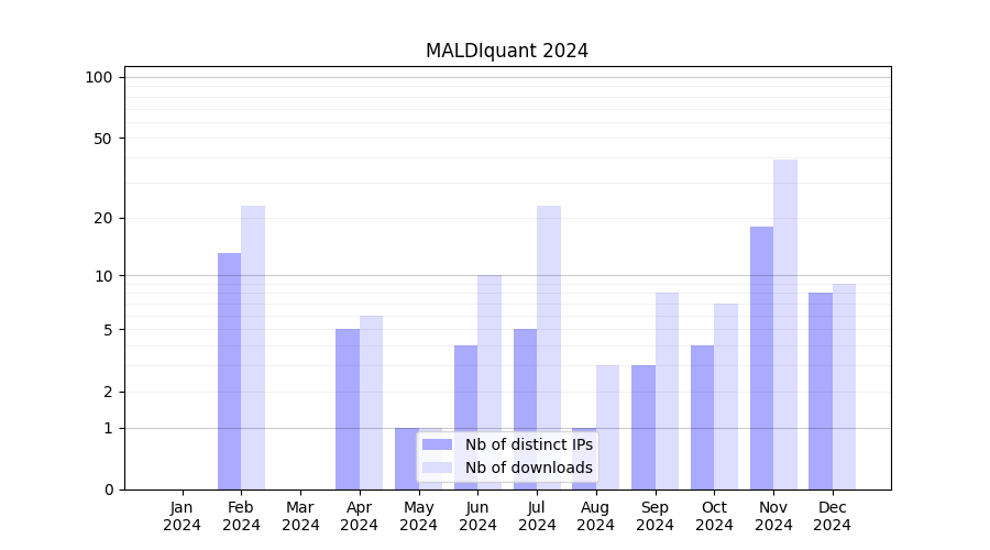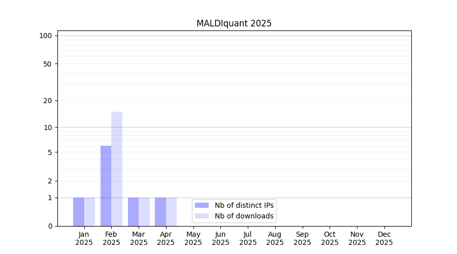 Number of downloads for workflow package MALDIquant, year by year, from 2025 back to 2015 (years with no downloads are omitted):