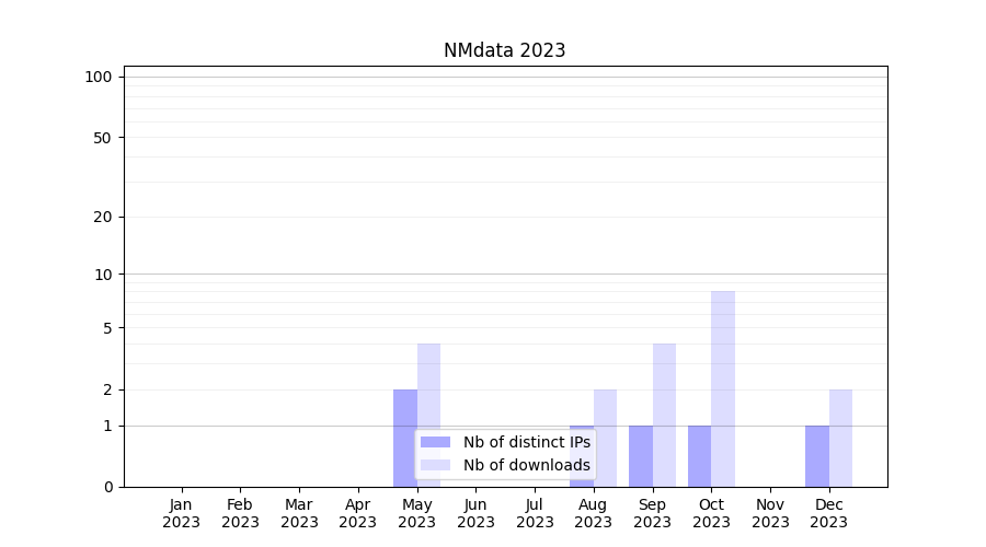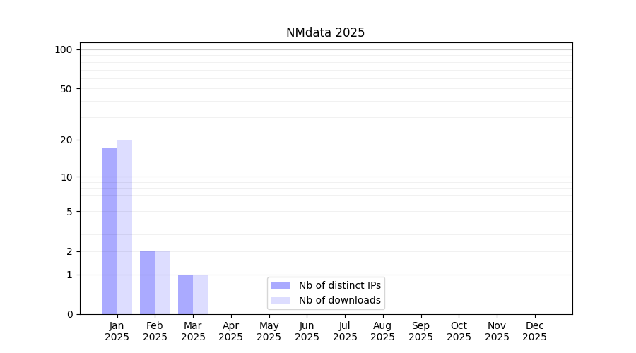 Number of downloads for workflow package NMdata, year by year, from 2025 back to 2015 (years with no downloads are omitted):