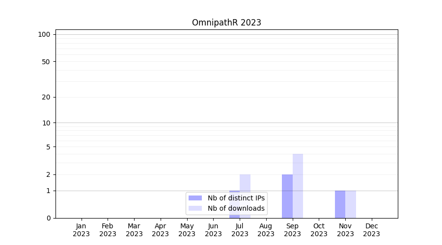 Number of downloads for workflow package OmnipathR, year by year, from 2025 back to 2015 (years with no downloads are omitted):