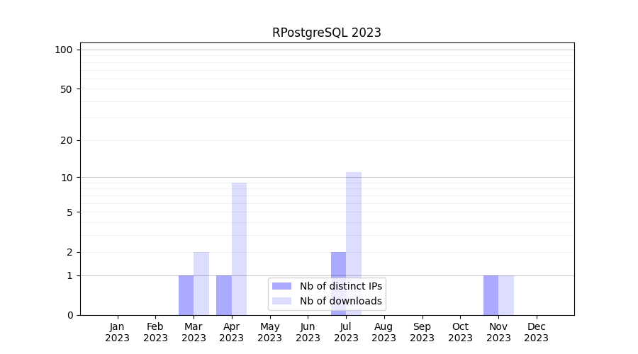Number of downloads for workflow package RPostgreSQL, year by year, from 2025 back to 2015 (years with no downloads are omitted):