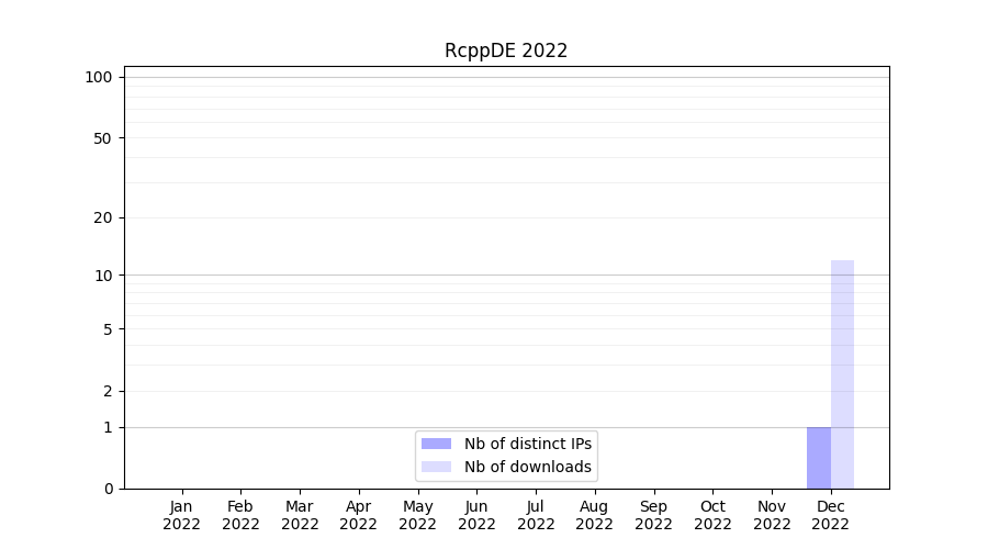 Number of downloads for workflow package RcppDE, year by year, from 2025 back to 2015 (years with no downloads are omitted):